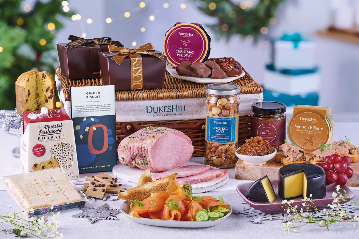 Even Scrooge himself would discover his Christmas spirit when presented with this stunning 'Bah Humbug' Christmas hamper from DukesHill. Delivered in a reusable wicker basket complete with leather straps, you'll receive a delightful mix of sweet and savoury treats, including: