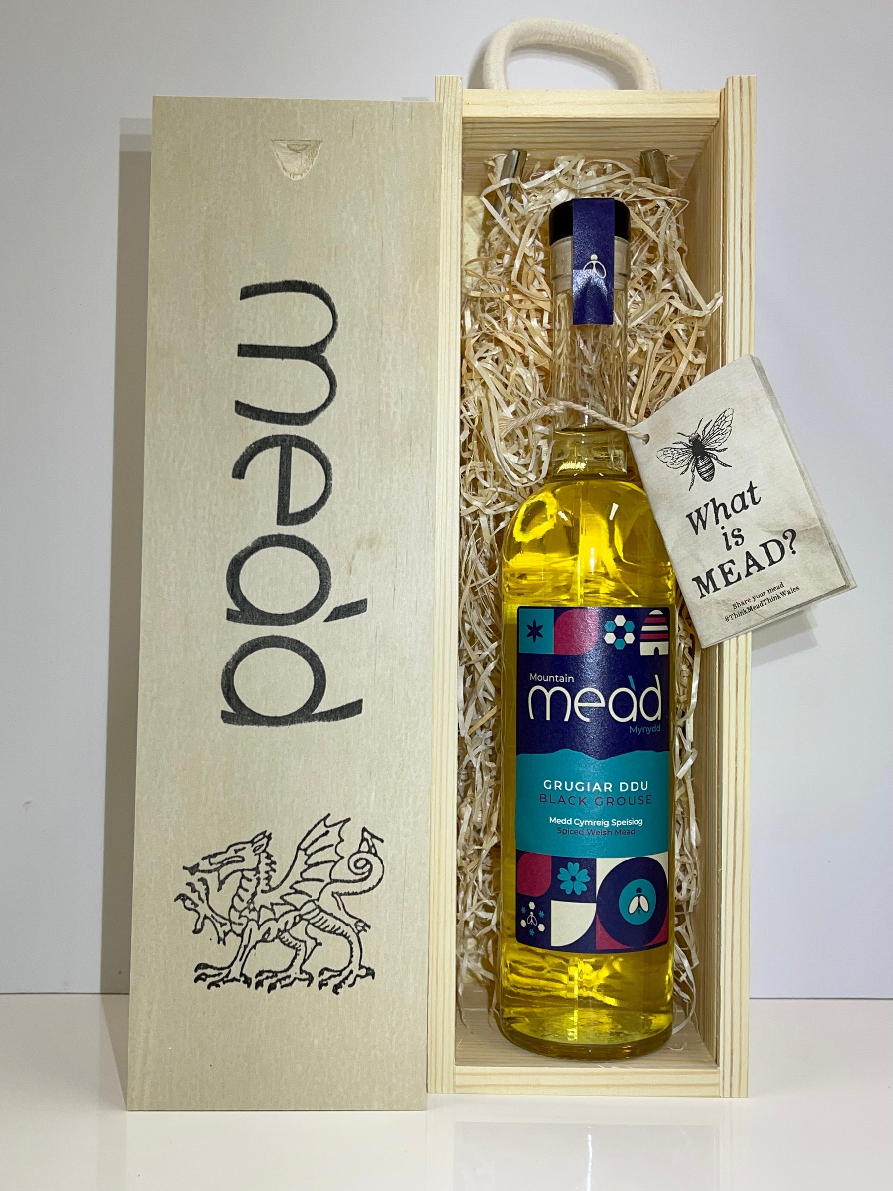 The Black Grouse - Grugiar Ddu from Mountain Mead is a medium sweet metheglin*, or spiced mead. It comes in a wooden gift box. Perfect if you're looking for a corporate gift or you're buying mead as a gift.