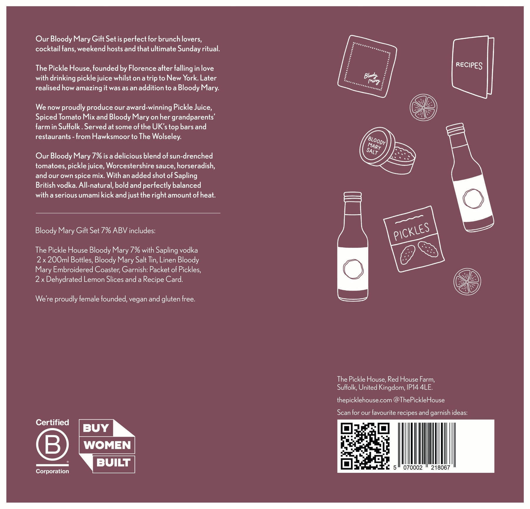 This gift box includes: The Pickle House Bloody Mary 7% 2 x 200ml • The Pickle House Bloody Mary Salt Rim (Cayenne, Lemon, Smoked Salt and celery salt) • Linen embroidered Bloody Mary coaster • Serious Pig Pickles Garnish • Dehydrated Lemon Garnish 2 x Slices • Recipe Card