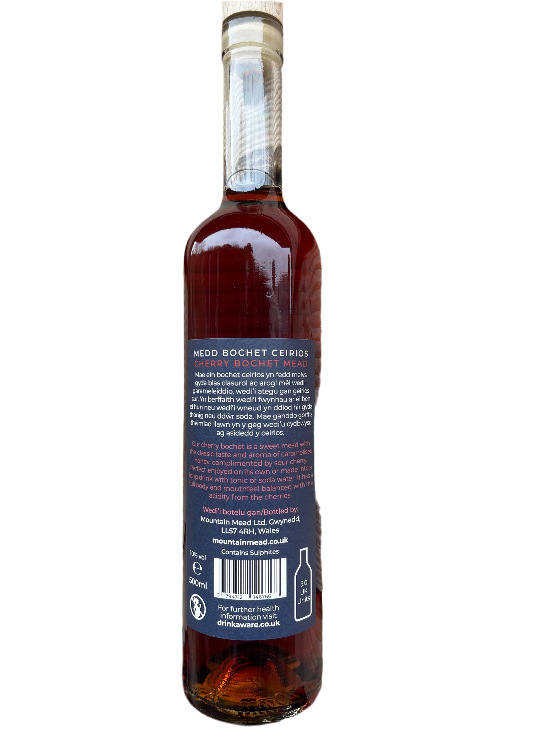 The Cherry Bochet (Medd Bochet Ceirios) from Mountain Mead is a sweet and sour, cherry mead, balancing the sour cherry with sweet, slightly caramelised honey. It is juicy, fresh, and very quaffable!
