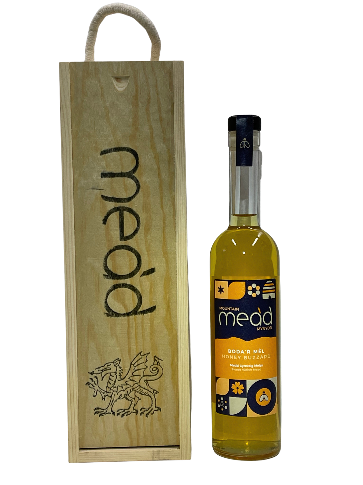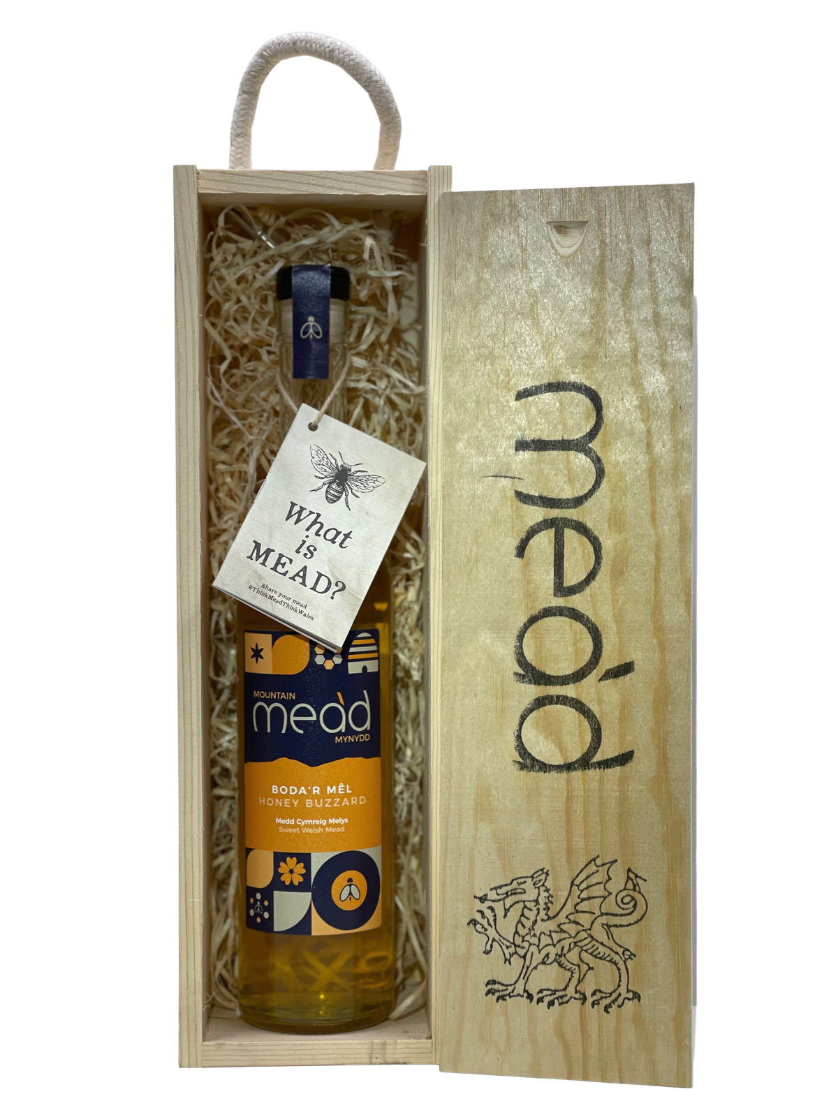 The Honey Buzzard or Boda'r Mêl yn Cymraeg from Mountain Mead is an award winning sweet mead. It comes in a wooden gift box, perfect if you're looking for a corporate gift or buying mead as a gift.