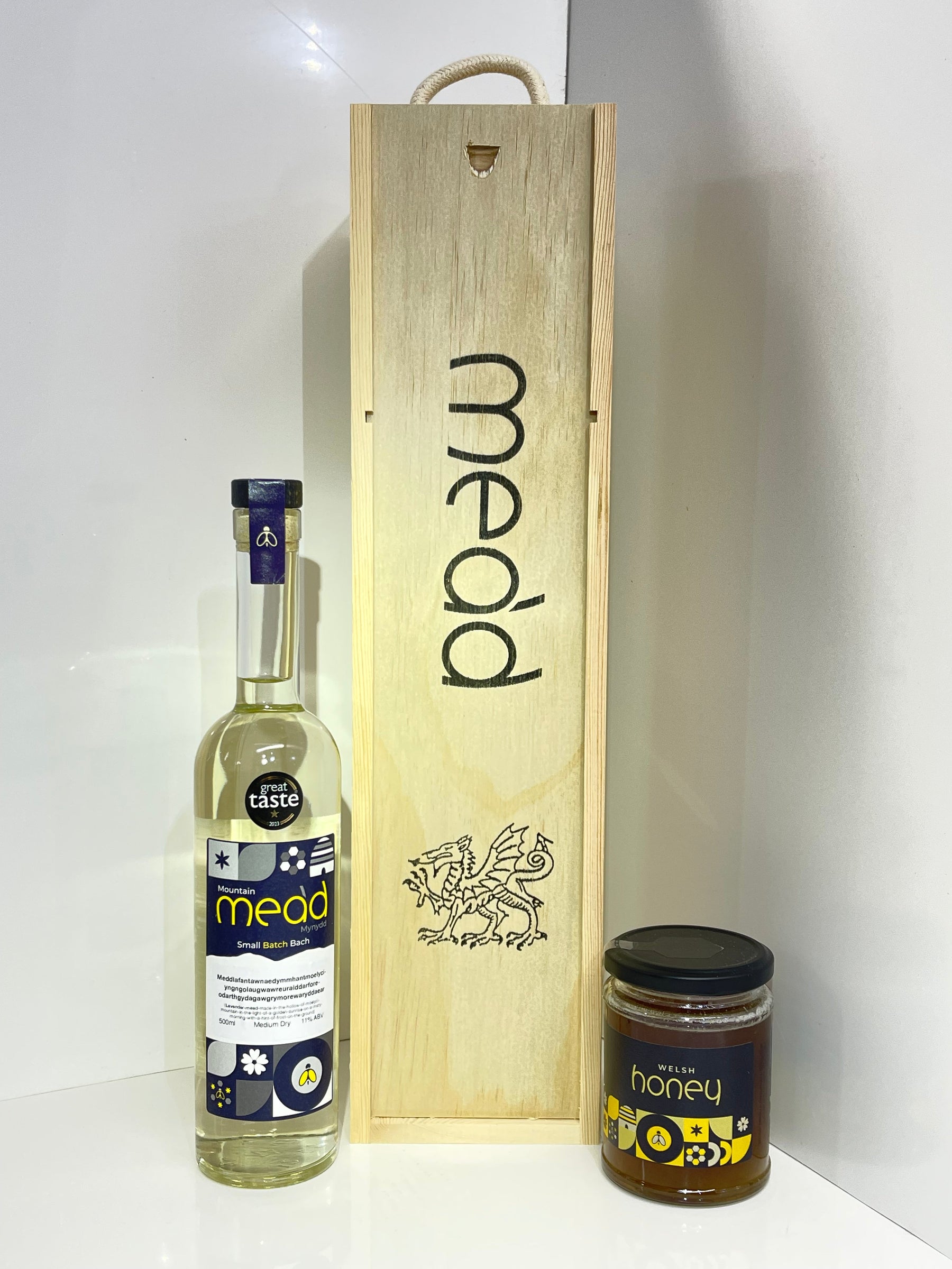 This mead is 11% ABV and comes in a 500ml glass bottle with a resealable wooden-topped cork closure. It is presented in a wooden gift box with 100% recyclable packaging, and a jar of Welsh honey.