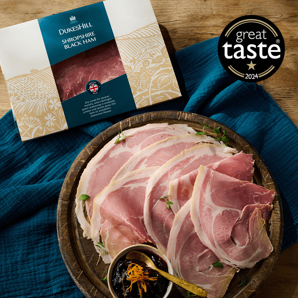 A beautifully rich and mature Shropshire Black Ham from DukesHill, hand sliced to perfection by their master butchers and produced using the finest quality outdoor reared British pork.