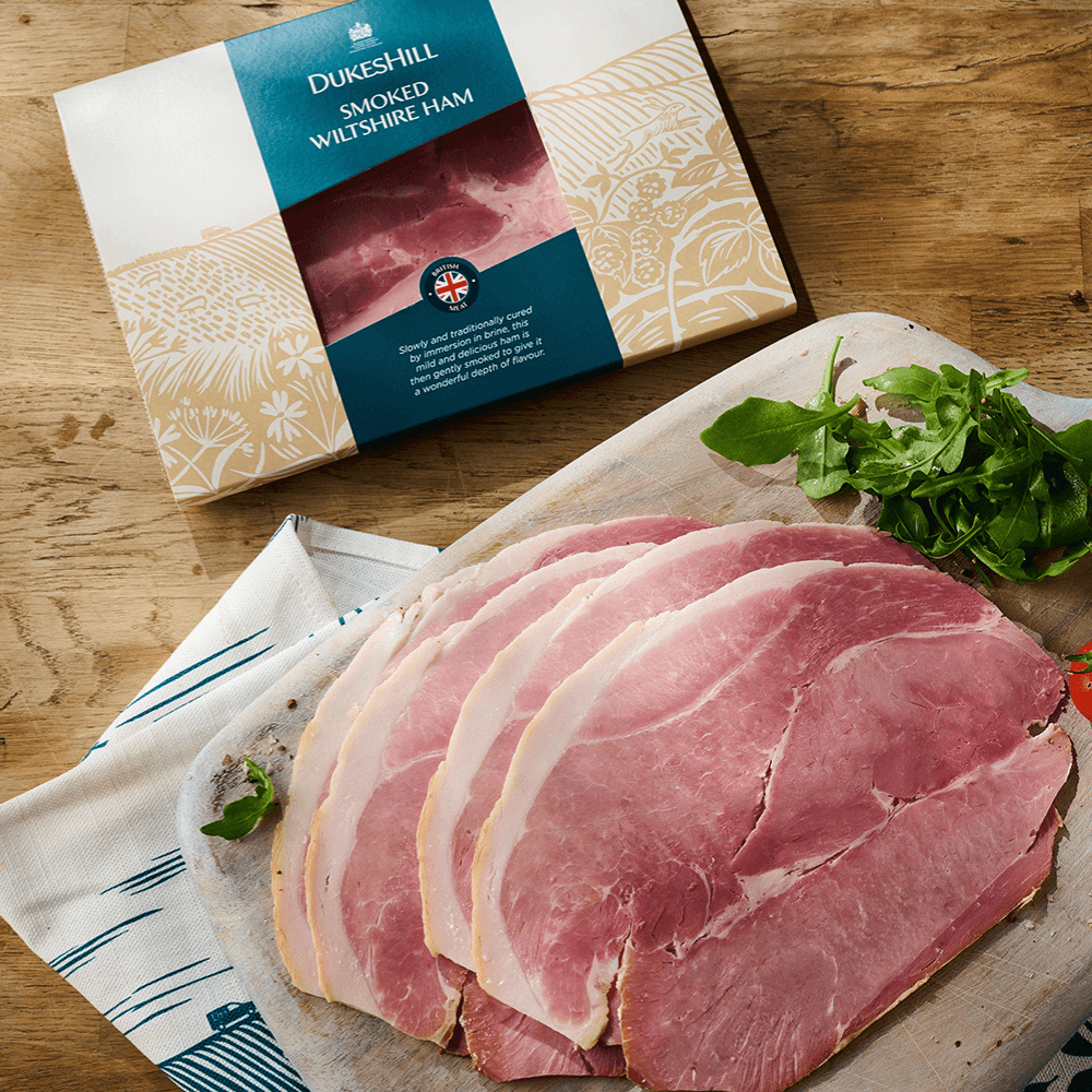 A beautifully rich and flavoursome Smoked Wiltshire Ham from DukesHill, hand sliced to perfection by their master butchers and produced using the finest quality outdoor reared British pork.