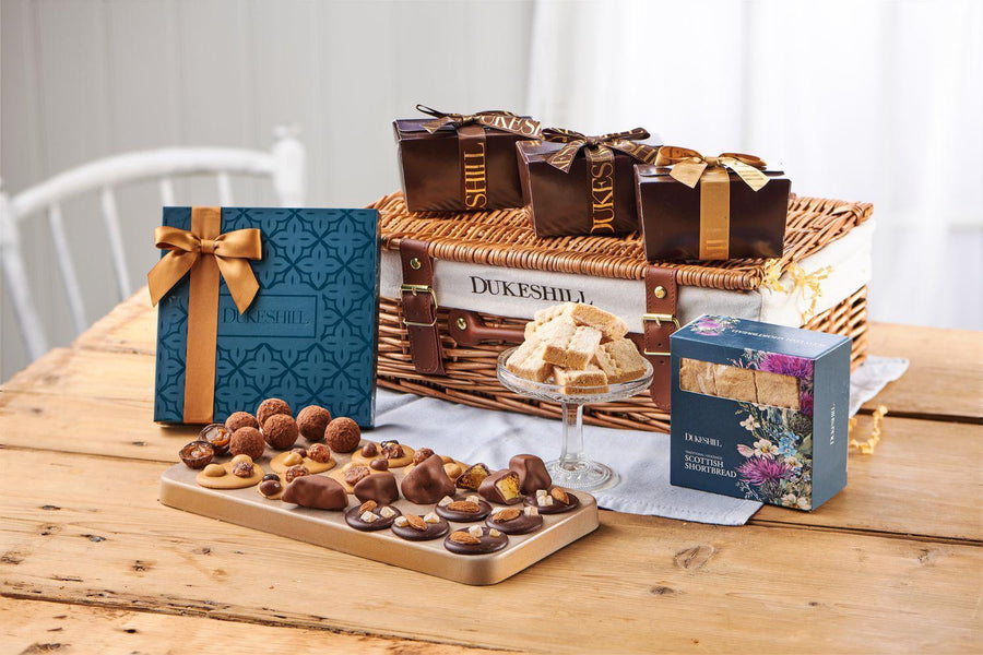 A thoughtful gift for anyone with a sweet tooth who enjoys the finer things in life. In a wicker DukesHill hamper, you'll receive: