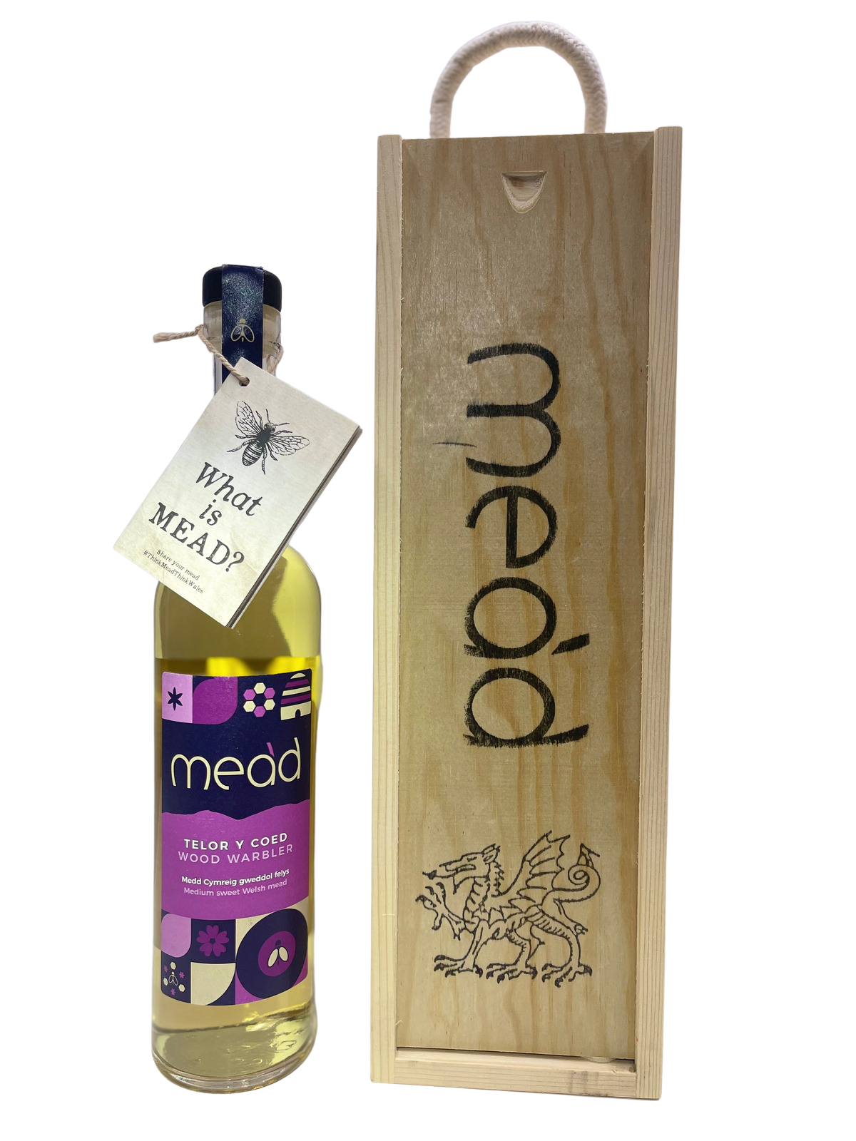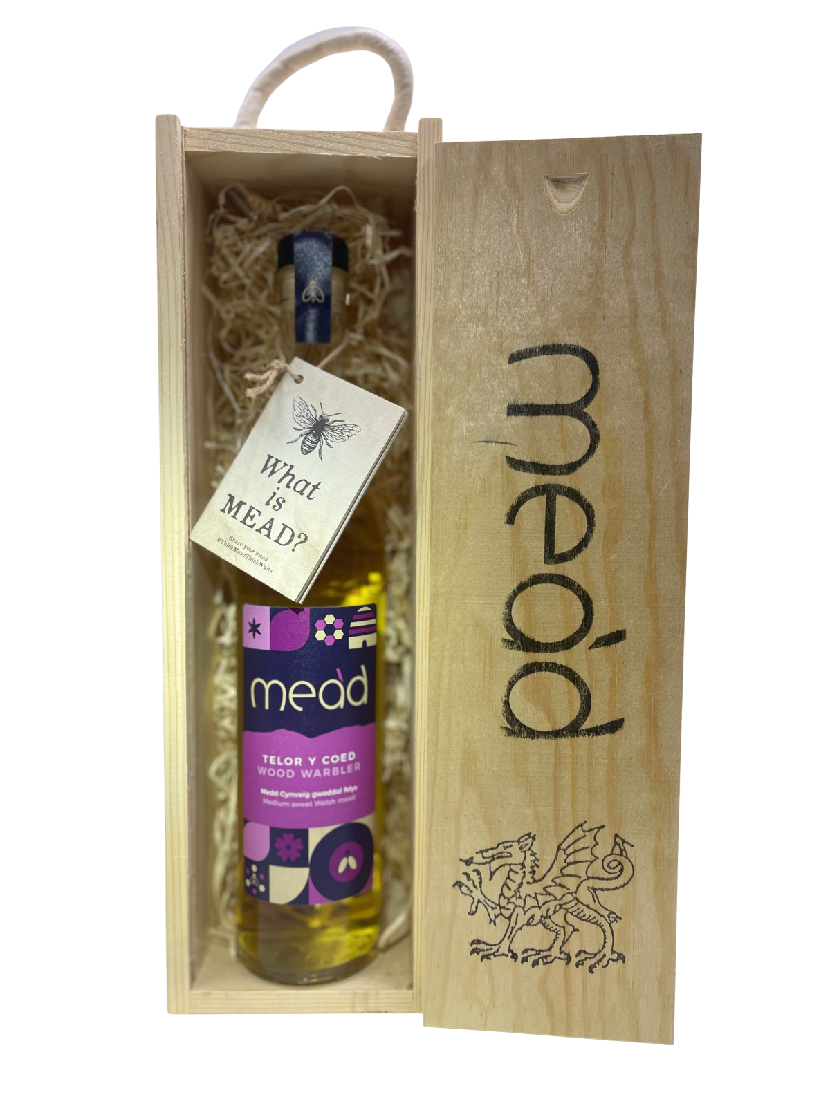 Wood Warbler - Telor Y Coed from Mountain Mead is a medium sweet mead made from sunflower honey, in a wooden gift box. Perfect if you're looking for a corporate gift or you're buying mead as a gift.