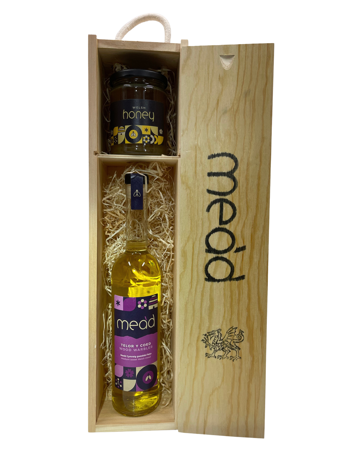 This mead is 13% ABV and comes in a 500ml glass bottle with a resealable wooden-topped cork closure. It is presented in a wooden gift box with 100% recyclable packaging, and a jar of Welsh honey.